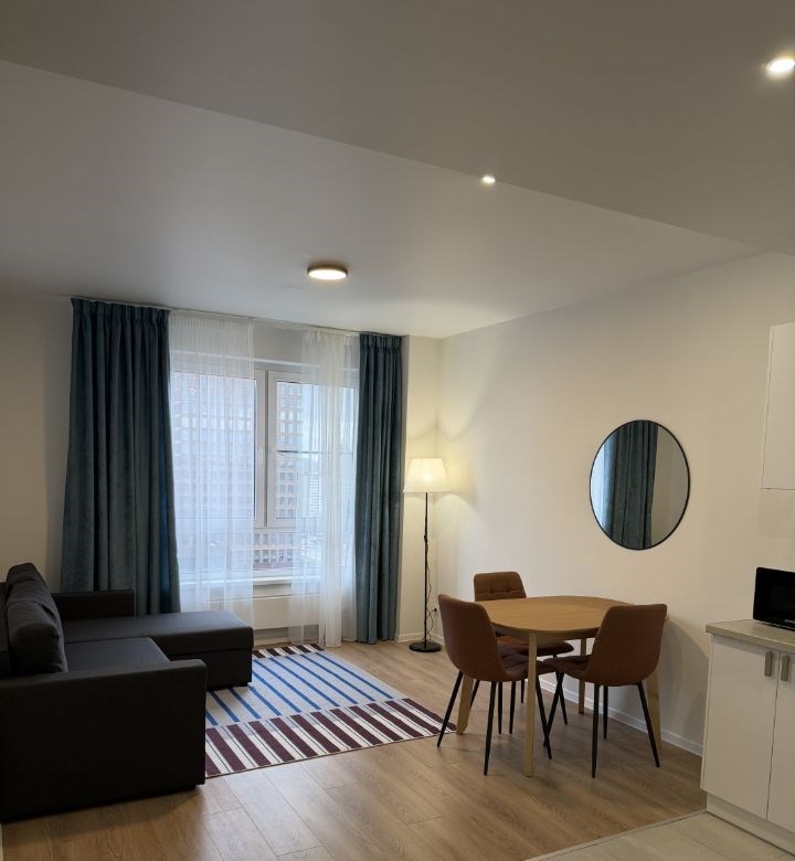 сдаётся однокомнатная квартира с евроремонтом, расположенная на 15м этаже нового монолитного дома 2022 года постройки. общая площадь квартиры составляет 38 кв. м, из них 13 кв. м занимает жилая зона, а 18 кв. м кухнягостиная. высокие потолки 2.7 метра создают ощущение простора. окна выходят на улицу, открывая приятный вид.квартира полностью обставлена мебелью и оснащена необходимой техникой, включая холодильник и стиральную машину и т.п. просторная кухня станет отличным местом для семейных ужинов и встреч с друзьями. в шаговой доступности метро озёрная.дом находится в районе с развитой инфраструктурой.агентам комиссию не оплачиваем.