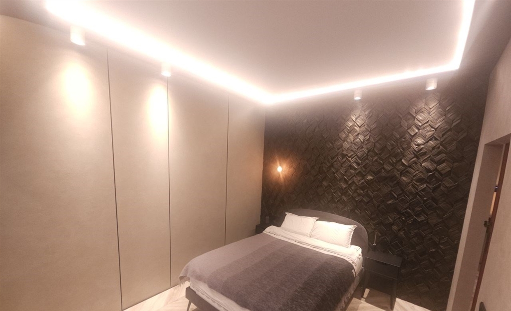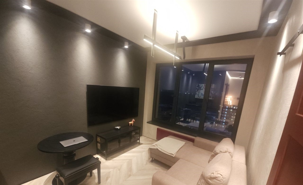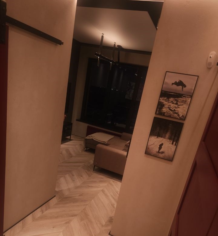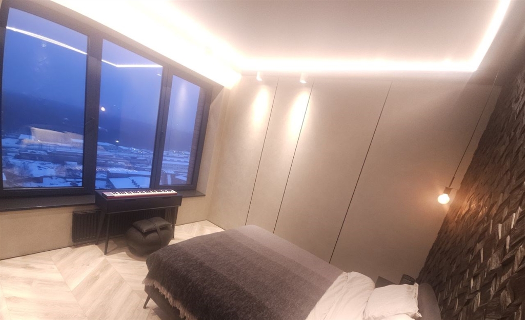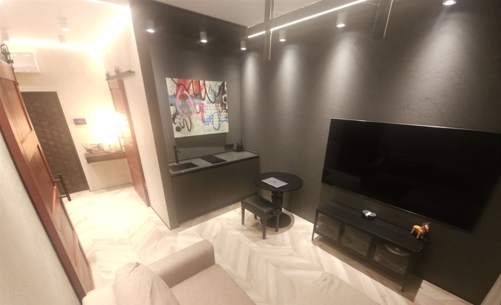 это апартамент для тех, кто любит чистый минимализм, но хочет, чтобы у интерьера был характер графит, дерево, черный металл и акценты. это пространство про вкус и свободу меньше вещей больше воздуха, света и настроения. в гостиной кино и музыка, фактурная темная стена и аккуратная зона отдыха, которая не перегружает комнату. спальня получилась камерной и расслабляющей мягкий свет, глубокие оттенки и ощущение приватности. есть отдельная гардеробнаяхозяйственная зона, чтобы видимое оставалось эстетичным, а нужное скрытым. санузел минималистичная чернобежовая с матовой душевой, стильным черным унитазом и теплым ledсветом.